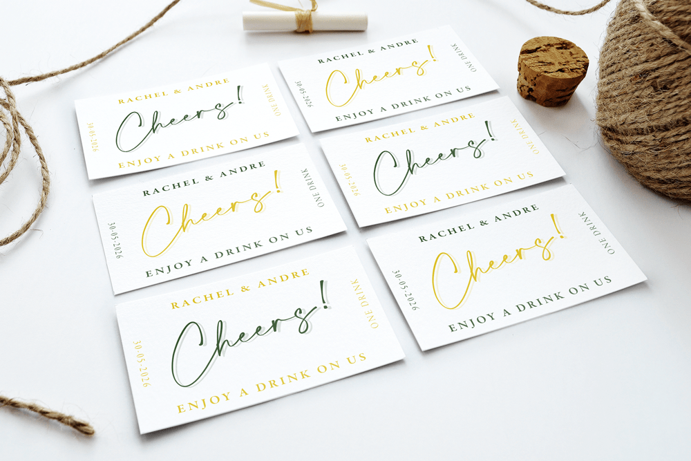 Add a dash of fun to your wedding with our beautiful personalised drink tokens. Ideal for signature cocktails, bar tabs, or a round on the happy couple!