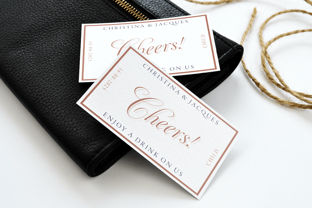 Add a dash of fun to your wedding with our beautiful personalised drink tokens. Ideal for signature cocktails, bar tabs, or a round on the happy couple!