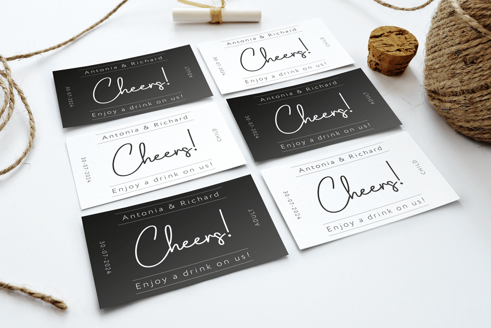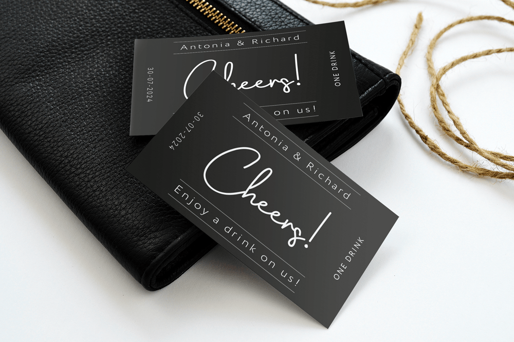 Add a dash of fun to your wedding with our beautiful personalised drink tokens. Ideal for signature cocktails, bar tabs, or a round on the happy couple!
