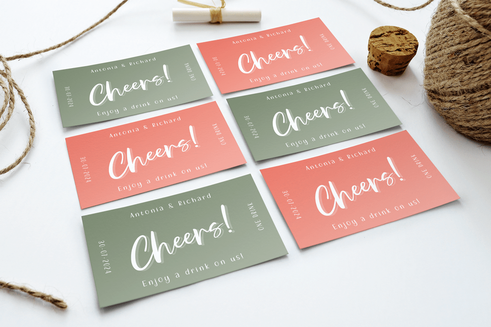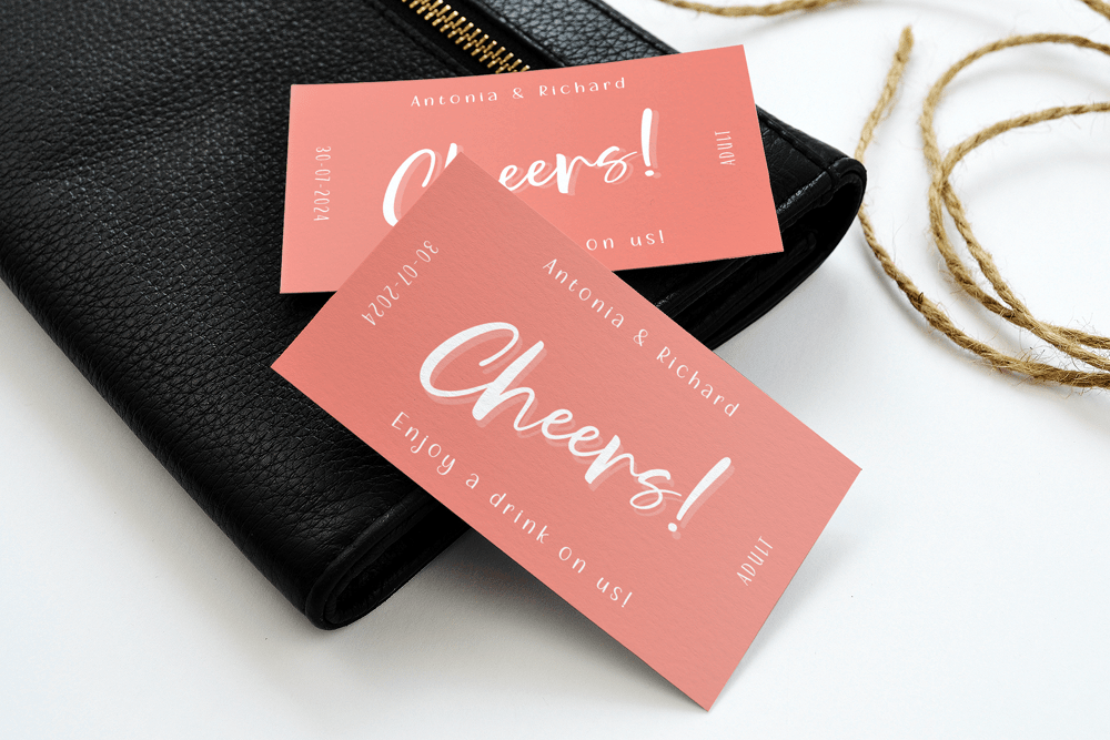 Add a dash of fun to your wedding with our beautiful personalised drink tokens. Ideal for signature cocktails, bar tabs, or a round on the happy couple!