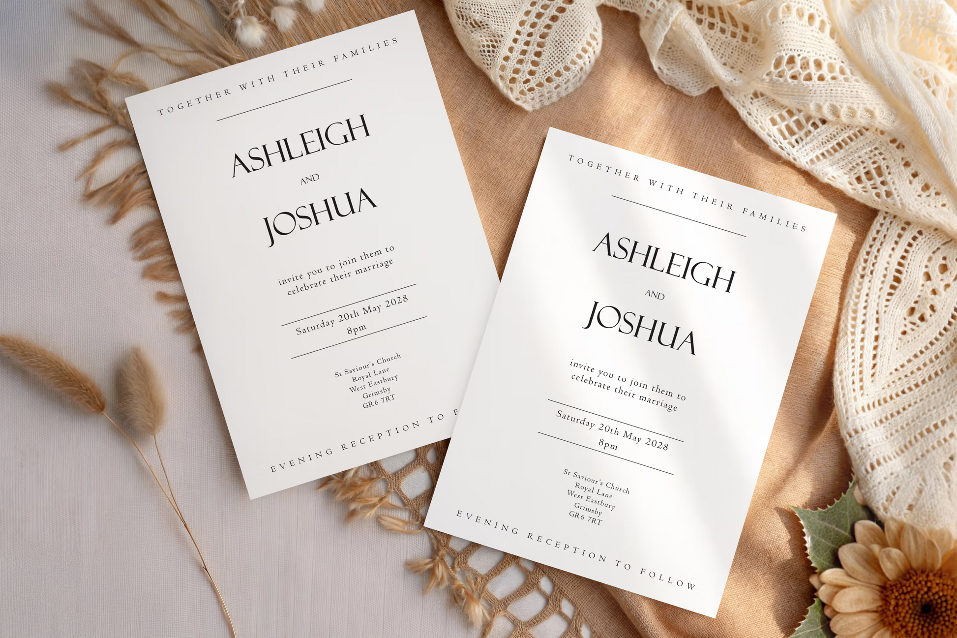 Luxe is driven by bold typographic scale and confident layout. Oversized statement text is paired with clean supporting details, using strong alignment and generous spacing to create stationery with presence, clarity and a sense of modern luxury from first glance to final detail.